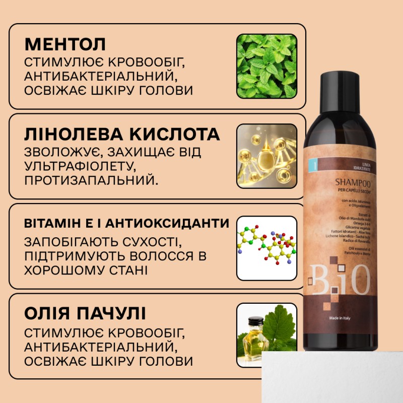 Жирні кислоти Омега-6. Лінолева кислота існує у зовнішньому шарі шкіри (епідермісі). Вона є важливим компонентом клітинних мембран, відсутність якої може призвести, наприклад, до лущення шкіри. Лінолева кислота зволожує, захищає від ультрафіолету та має протизапальну дію. Вітамін Е та Антиоксиданти - запобігає сухості шкіри голови та підтримує волосся у відмінному стані. Вітамін Е також допомагає запобігати та усувати прояви шкірного запалення. Олія пачулі - робить волосся густим, міцним, здоровим, запобігає ламкості та появі лупи