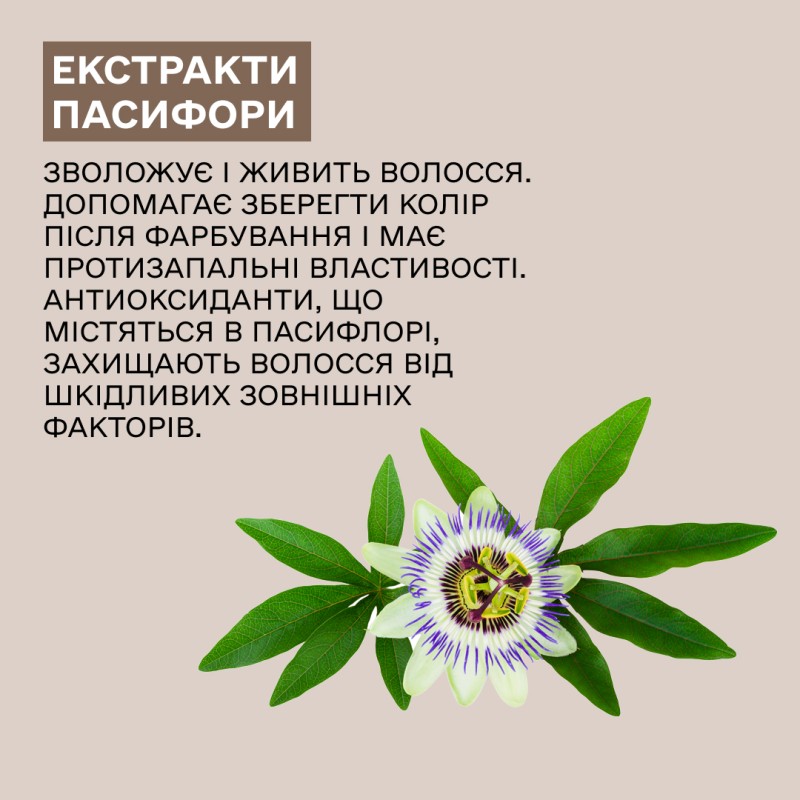 Екстракт пасифлори – зволожує, максимально живить та зберігає колір волосся після фарбування. Екстракт пасифлори має протизапальні властивості. Антиоксиданти в пасифлорі допомагають захищати волосся від шкідливих зовнішніх факторів, таких як вільні радикали та забруднення.