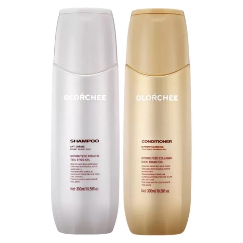 Шампунь Olorchee Anti Grease Shampoo с маслом чайного дерева и гидролизованным кератином глубоко очищает, уменьшает жирность и освежает кожу головы, а кондиционер Olorchee Nutrient Nourishing Conditioner восстанавливает поврежденные участки волос, делает полотно более гладким и эластичным.