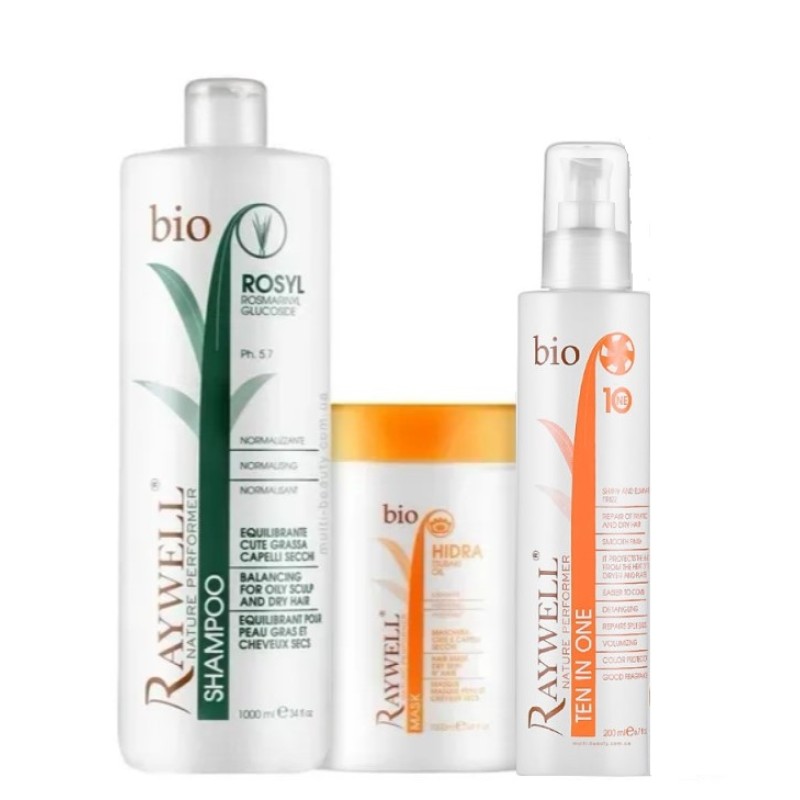 Набор для жирной кожи головы и сухих волос: Шампунь нормализующий BIO ROSYL, Маска Raywell BIO HIDRA, Молочко термозащита 10в1 Raywell BIO